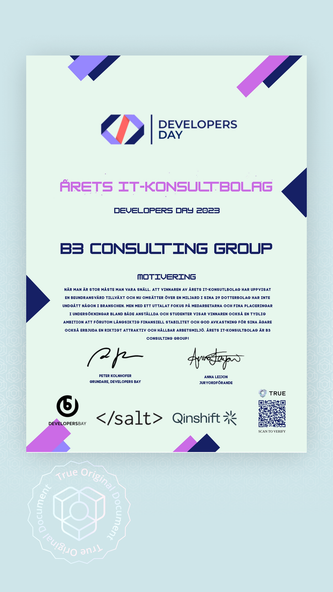Alla TRUE -document är säkrade med blockchain-teknologi och kan verifieras som äkta. Klicka på verifieringsknappen bredvid dokumentet eller skanna QR-koden med din smartphones kamera. Ingen app krävs - dokumentets äkthet verifieras omedelbart.