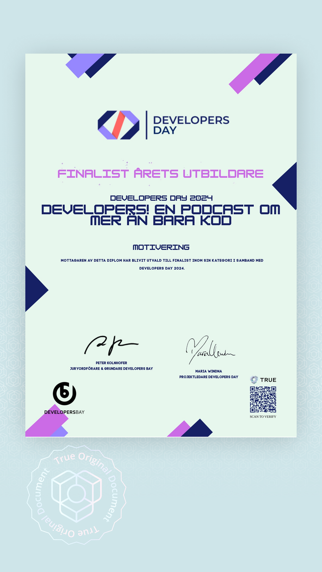 Alla TRUE -document är säkrade med blockchain-teknologi och kan verifieras som äkta. Klicka på verifieringsknappen bredvid dokumentet eller skanna QR-koden med din smartphones kamera. Ingen app krävs - dokumentets äkthet verifieras omedelbart.
