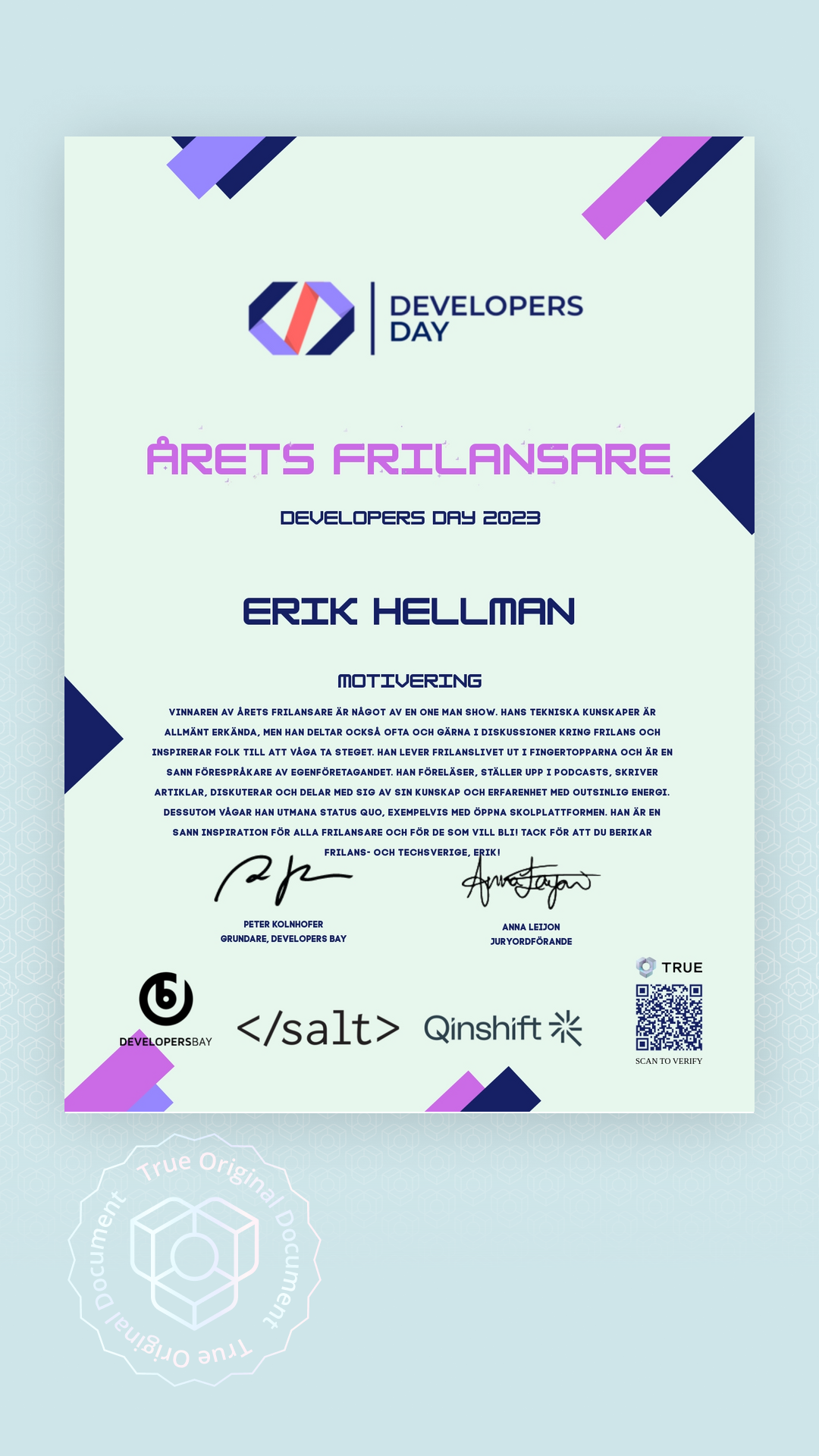 Du har tilldelats denna utmärkelse då du har utsetts till vinnare på Developers Day {data.added_date_year}!