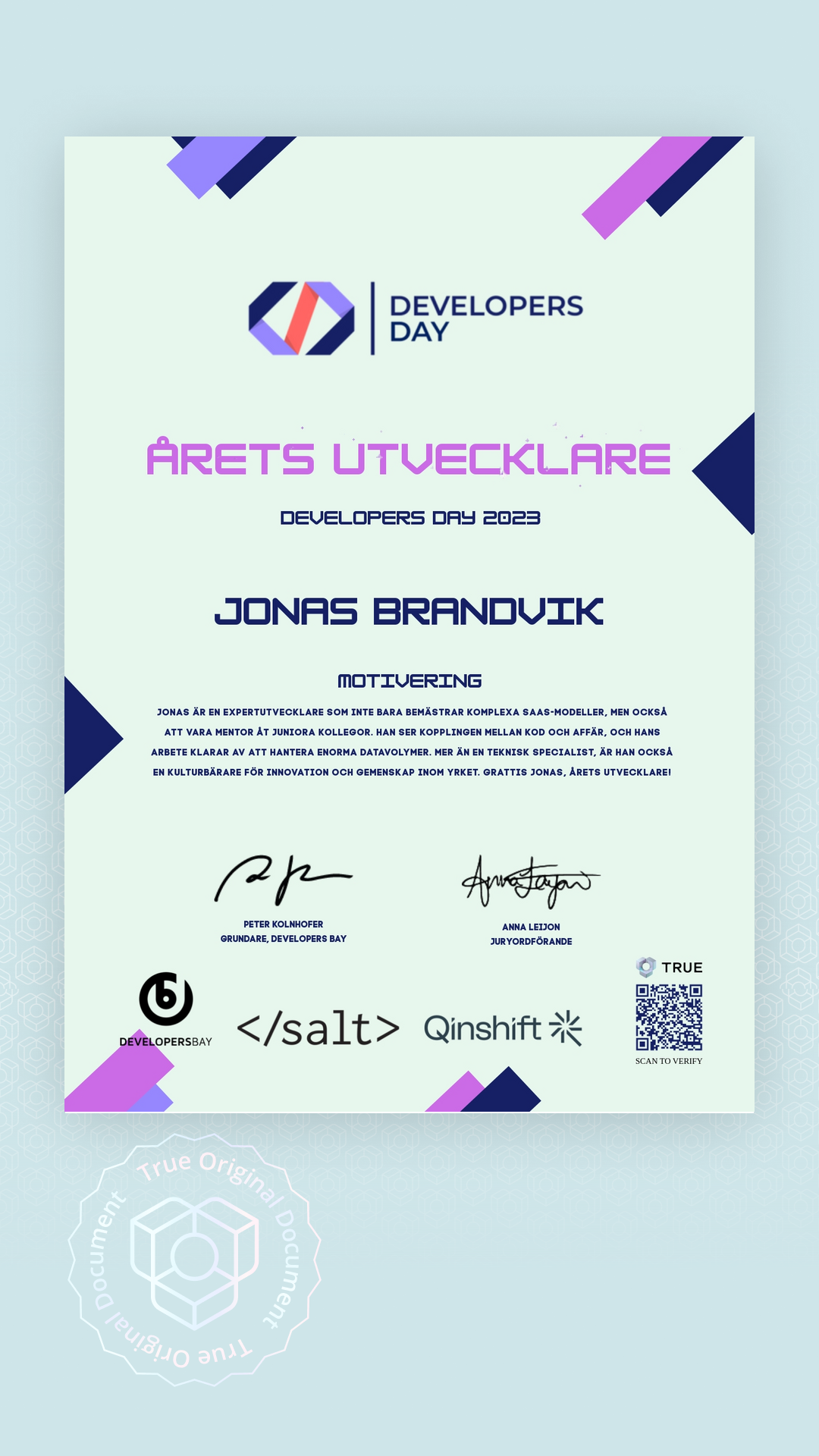 Du har tilldelats denna utmärkelse då du har utsetts till vinnare på Developers Day {data.added_date_year}!